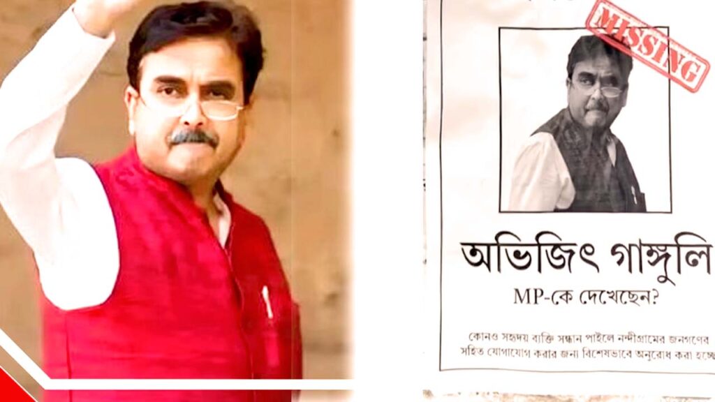 লোকসভা নির্বাচন ২০২৪ শেষ হওয়ার পর থেকেই নন্দীগ্রাম বিধানসভা এলাকায় সাংসদ অভিজিৎ গাঙ্গুলিকে কার্যত দেখা যাচ্ছে না—এমন অভিযোগ তুলে শুরু হয়েছে রাজনৈতিক তরজা। সেই অভিযোগকে সামনে রেখেই নন্দীগ্রামের বিভিন্ন প্রান্তে দেওয়ালে দেওয়ালে দেখা গেল ‘নিখোঁজ, সন্ধান চাই’ শীর্ষক পোস্টার, যেখানে নাম লেখা রয়েছে সদ্য নির্বাচিত সাংসদ অভিজিৎ গাঙ্গুলির।